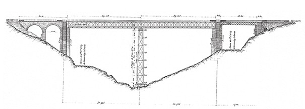 Le tablier métallique central de 98,5 mètres comprend 2 travées de 49,125 mètres de longueur. Il repose sur une pile métallique centrale dont les arbalétriers en fonte recourbés à leur base jouent le rôle de jambes de force.